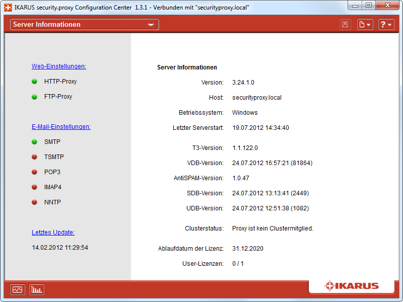 - Virüs veritabanı, antiSPAM veritabanı, URL filtreleme veritabanı ve IKARUS T3 TaramaMotoru ve IKARUS AntiSPAM Motoru tam otomatik artımlı güncelleme (her 10 dakikada bir)